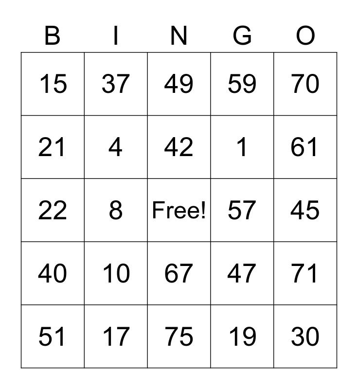 This bingo card has a free space and 24 words: 10, 17, 42, 51, 70, 15, 21, 37, 57, 67, 1, 22, 47, 71, 4, 19, 45, 49, 61, 8, 30, 40, 59 and 75.