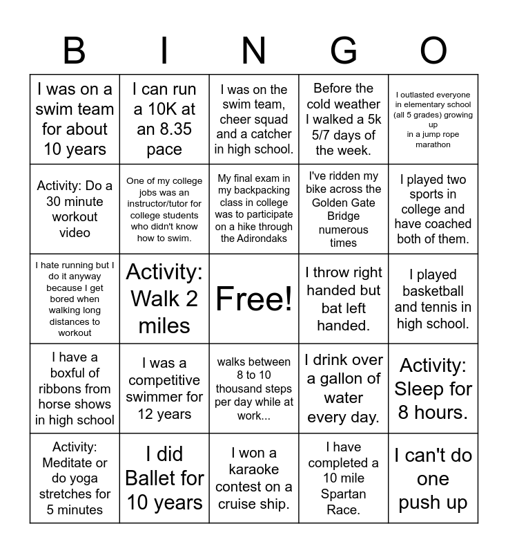 This bingo card has a free space and 24 words: I was a competitive swimmer for 12 years, I did Ballet for 10 years, My final exam in my backpacking class in college was to participate on a hike through the Adirondaks, Activity: Meditate or do yoga stretches for 5 minutes, I outlasted everyone in elementary school (all 5 grades) growing up in a jump rope marathon, I was on a swim team for about 10 years, Activity: Do a 30 minute workout video, I can run a 10K at an 8.35 pace, I throw right handed but bat left handed., walks between 8 to 10 thousand steps per day while at work..., I've ridden my bike across the Golden Gate Bridge numerous times, I hate running but I do it anyway because I get bored when walking long distances to workout, I drink over a gallon of water every day., Activity: Sleep for 8 hours., One of my college jobs was an instructor/tutor for college students who didn't know how to swim., I have completed a 10 mile Spartan Race., I played basketball and tennis in high school., I was on the swim team, cheer squad and a catcher in high school., I played two sports in college and have coached both of them., Activity: Walk 2 miles, I can't do one push up, I have a boxful of ribbons from horse shows in high school, Before the cold weather I walked a 5k 5/7 days of the week. and I won a karaoke contest on a cruise ship..