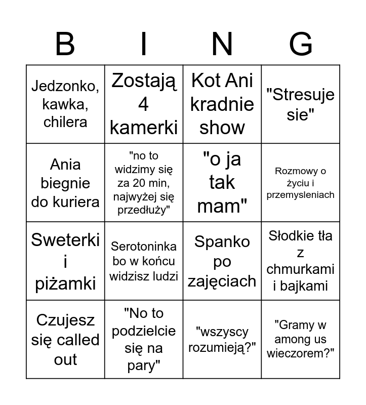 This bingo card has 16 words: Czujesz się called out, "No to podzielcie się na pary", Kot Ani kradnie show, "Stresuje sie", Ania biegnie do kuriera, Zostają 4 kamerki, Spanko po zajęciach, Słodkie tła z chmurkami i bajkami, Jedzonko, kawka, chilera, "no to widzimy się za 20 min, najwyżej się przedłuży", "wszyscy rozumieją?", Rozmowy o życiu i przemysleniach, Sweterki i piżamki, Serotoninka bo w końcu widzisz ludzi, "o ja tak mam" and "Gramy w among us wieczorem?".