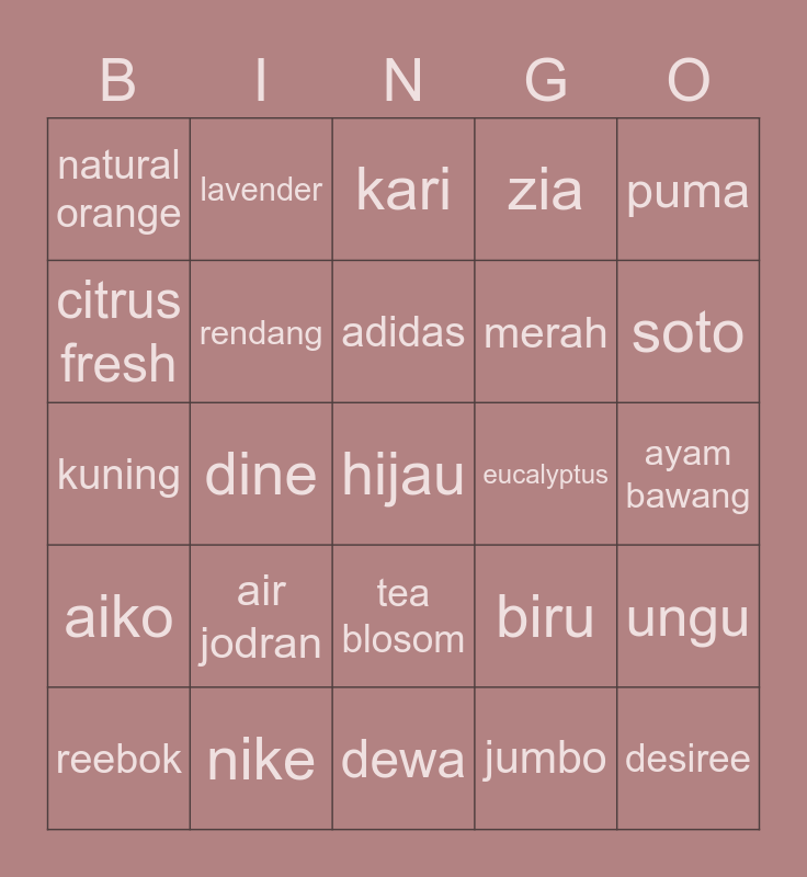 This bingo card has a free space and 24 words: air jodran, nike, adidas, reebok, puma, natural orange, citrus fresh, lavender, eucalyptus, tea blosom, merah, kuning, biru, ungu, rendang, jumbo, ayam bawang, kari, soto, dine, desiree, aiko, zia and dewa.