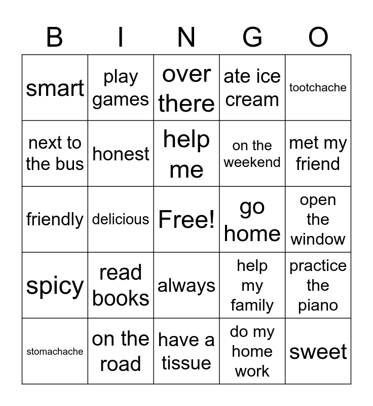 This bingo card has a free space and 24 words: stomachache, read books, help me, do my home work, tootchache, smart, play games, over there, go home, open the window, friendly, honest, help my family, practice the piano, next to the bus, on the road, have a tissue, ate ice cream, met my friend, spicy, delicious, always, on the weekend and sweet.