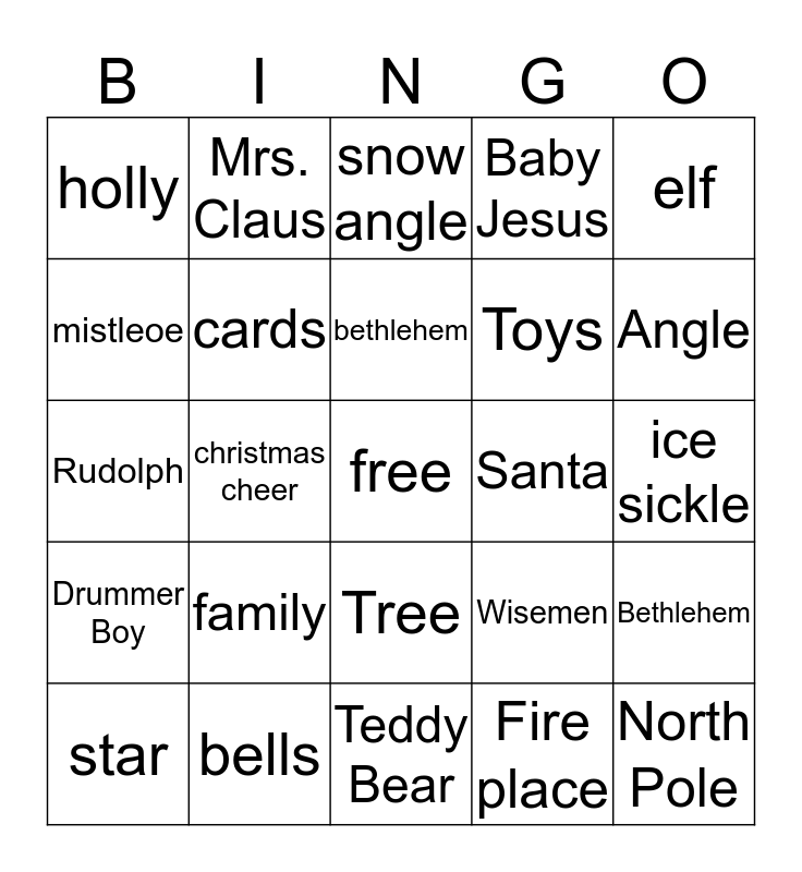 This bingo card has a free space and 24 words: family, bells, bethlehem, star, elf, holly, mistleoe, Mrs. Claus, Santa, Tree, Toys, Rudolph, Wisemen, Bethlehem, cards, Fire place, ice sickle, snow angle, Angle, christmas cheer, North Pole, Drummer Boy, Baby Jesus and Teddy Bear.