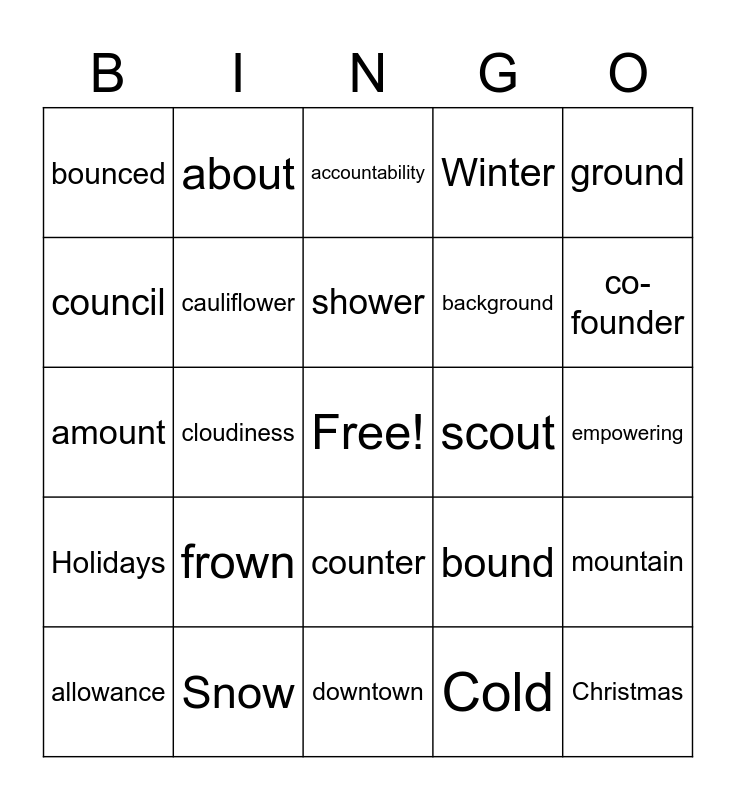 This bingo card has a free space and 25 words: frown, downtown, shower, allowance, ground, bounced, council, about, scout, counter, background, amount, bound, mountain, cauliflower, endowment, empowering, accountability, co-founder, cloudiness, Christmas, Snow, Holidays, Winter and Cold.