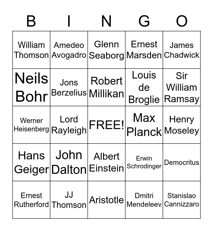 This bingo card has a free space and 24 words: John Dalton, JJ Thomson, Robert Millikan, Ernest Rutherford, James Chadwick, William Thomson, Neils Bohr, Amedeo Avogadro, Max Planck, Albert Einstein, Louis de Broglie, Werner Heisenberg, Erwin Schrodinger, Democritus, Jons Berzelius, Dmitri Mendeleev, Henry Moseley, Glenn Seaborg, Sir William Ramsay, Lord Rayleigh, Stanislao Cannizzaro, Hans Geiger, Ernest Marsden and Aristotle.