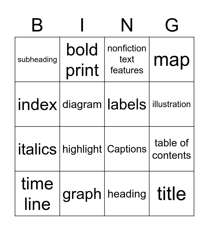 This bingo card has 19 words: Captions, Free!, nonfiction text features, title, table of contents, index, heading, subheading, bold print, italics, highlight, diagram, labels, graph, time line, glossary, map, illustration and photograph.