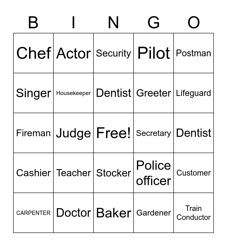 This bingo card has a free space and 24 words: Teacher, Doctor, Dentist, CARPENTER, Postman, Chef, Singer, Actor, Secretary, Stocker, Greeter, Fireman, Police officer, Customer, Housekeeper, Gardener, Dentist, Security, Lifeguard, Judge, Train Conductor, Cashier, Pilot and Baker.
