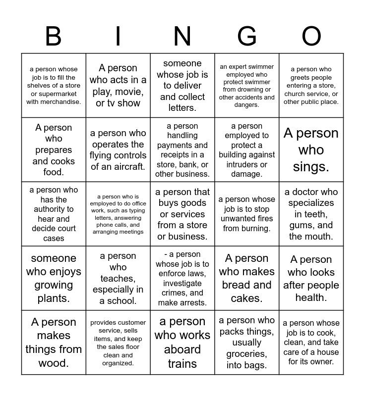 This bingo card has a free space and 24 words: a person who teaches, especially in a school., provides customer service, sells items, and keep the sales floor clean and organized., a person handling payments and receipts in a store, bank, or other business., A person makes things from wood., a person who greets people entering a store, church service, or other public place., a person whose job is to fill the shelves of a store or supermarket with merchandise., A person who prepares and cooks food., A person who acts in a play, movie, or tv show, a person whose job is to stop unwanted fires from burning., - a person whose job is to enforce laws, investigate crimes, and make arrests., a person employed to protect a building against intruders or damage., a person who has the authority to hear and decide court cases, A person who makes bread and cakes., A person who looks after people health., a person who operates the flying controls of an aircraft., a person who packs things, usually groceries, into bags., a doctor who specializes in teeth, gums, and the mouth., someone whose job is to deliver and collect letters., A person who sings., a person who is employed to do office work, such as typing letters, answering phone calls, and arranging meetings, a person whose job is to cook, clean, and take care of a house for its owner., someone who enjoys growing plants., an expert swimmer employed who protect swimmer from drowning or other accidents and dangers. and a person who works aboard trains.
