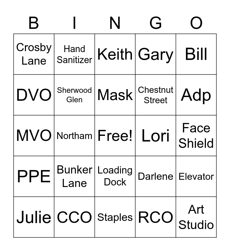 This bingo card has a free space and 24 words: Bunker Lane, CCO, Mask, Julie, Bill, Crosby Lane, DVO, Hand Sanitizer, Lori, Loading Dock, Chestnut Street, MVO, Darlene, Elevator, Sherwood Glen, RCO, Face Shield, Keith, Adp, Northam, Art Studio, PPE, Gary and Staples.