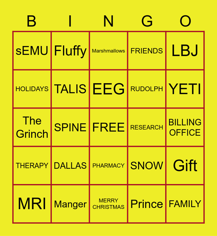 This bingo card has a free space and 39 words: BRAIN, NCD, NRD, TALIS, MRI, PHARMACY, EEG, EMG, LBJ, THERAPY, SPINE, FRIENDS, FAMILY, BILLING OFFICE, RESEARCH, DALLAS, TEXAS, sEMU, SANTA, SNOW, HOLIDAYS, MERRY CHRISTMAS, RUDOLPH, YETI, The Elf, Christmas Story, Papa Elf, Leg Lamp, Candy Cane Lane, Fluffy, Stockings, Hot Cocoa, Marshmallows, Manger, Prince, Apple Cider, Gift, The Grinch and Home Alone.