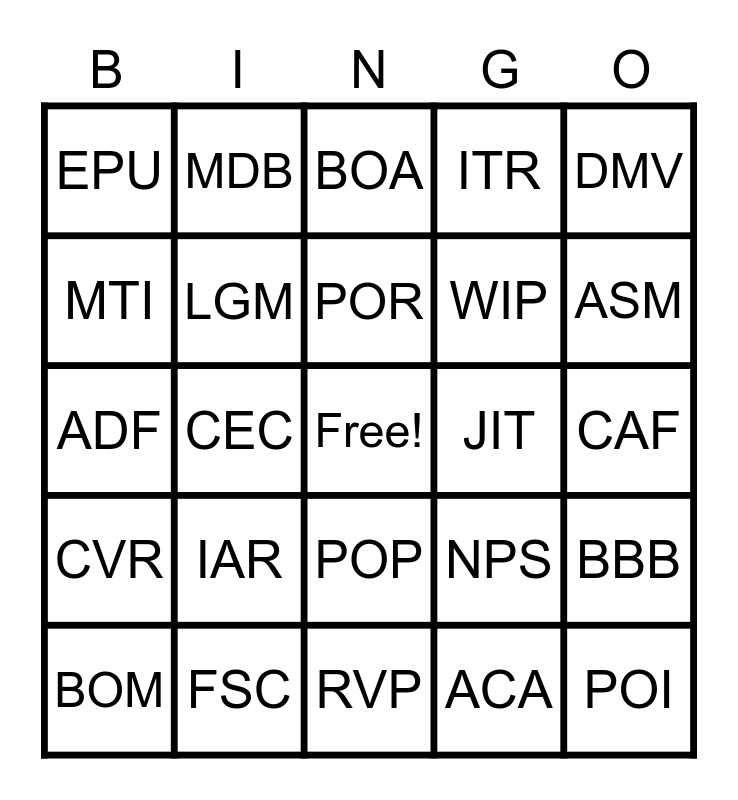 This bingo card has a free space and 24 words: IAR, FSC, POR, BOM, DMV, EPU, MTI, MDB, JIT, POP, WIP, ADF, NPS, BBB, LGM, ACA, CAF, BOA, ASM, CEC, POI, CVR, ITR and RVP.