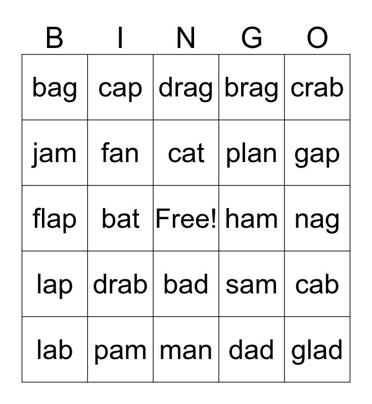 This bingo card has a free space and 24 words: drab, pam, cat, lab, crab, bag, jam, cap, ham, bad, plan, flap, sam, cab, fan, dad, nag, drag, gap, bat, glad, lap, brag and man.