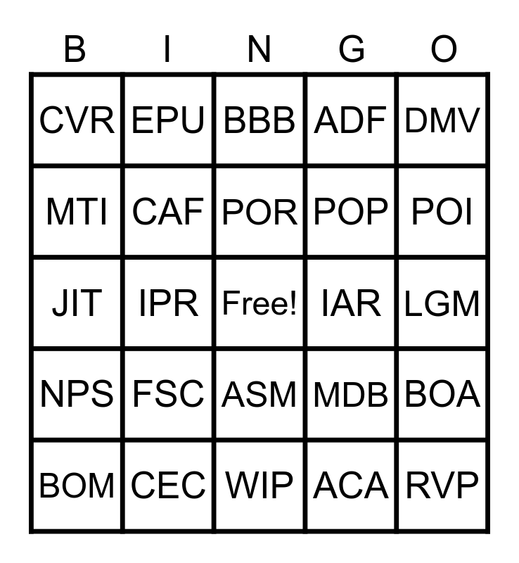 This bingo card has a free space and 24 words: FSC, CEC, POR, BOM, DMV, CVR, MTI, EPU, IAR, ASM, POP, JIT, MDB, BOA, CAF, ACA, LGM, BBB, POI, IPR, RVP, NPS, ADF and WIP.