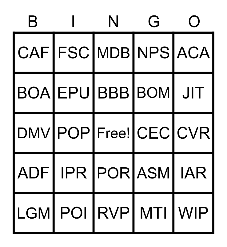 This bingo card has a free space and 24 words: IPR, POI, BBB, LGM, ACA, CAF, BOA, FSC, CEC, POR, BOM, DMV, ASM, IAR, EPU, MTI, CVR, MDB, JIT, POP, WIP, ADF, NPS and RVP.