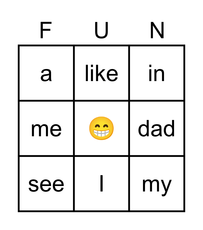 This bingo card has a free space and 14 words: at, the, see, like, me, my, look, name, I, a, mom, dad, in and it.