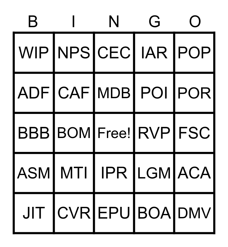 This bingo card has a free space and 24 words: MTI, CVR, MDB, JIT, POP, WIP, ADF, NPS, RVP, IPR, POI, BBB, LGM, ACA, CAF, BOA, FSC, CEC, POR, BOM, DMV, ASM, IAR and EPU.
