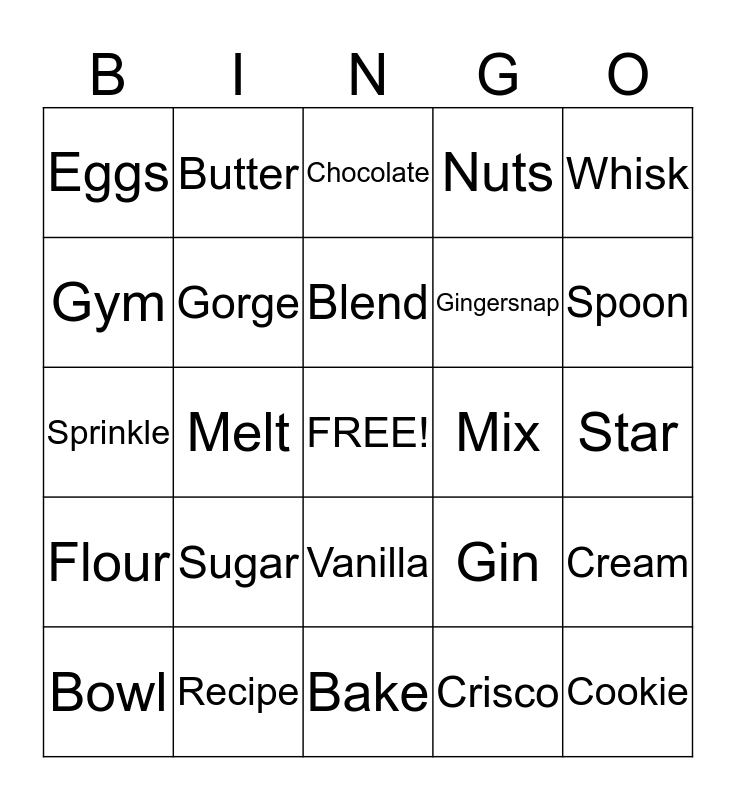This bingo card has a free space and 24 words: Sugar, Recipe, Blend, Bowl, Whisk, Eggs, Gym, Butter, Mix, Vanilla, Gingersnap, Sprinkle, Gin, Cream, Gorge, Crisco, Star, Chocolate, Spoon, Melt, Cookie, Flour, Nuts and Bake.