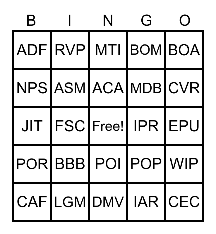 This bingo card has a free space and 24 words: BBB, LGM, ACA, CAF, BOA, ADF, NPS, RVP, IPR, POI, MDB, JIT, POP, WIP, ASM, IAR, EPU, MTI, CVR, FSC, CEC, POR, BOM and DMV.