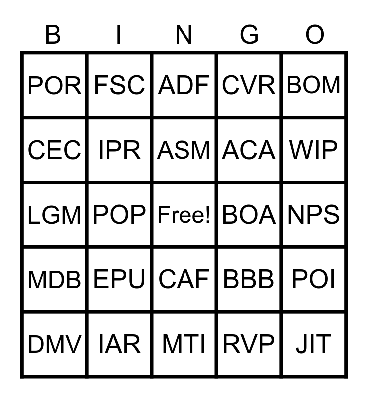 This bingo card has a free space and 24 words: EPU, IAR, ASM, DMV, BOM, POR, CEC, FSC, BOA, CAF, ACA, LGM, BBB, POI, IPR, RVP, NPS, ADF, WIP, POP, JIT, MDB, CVR and MTI.