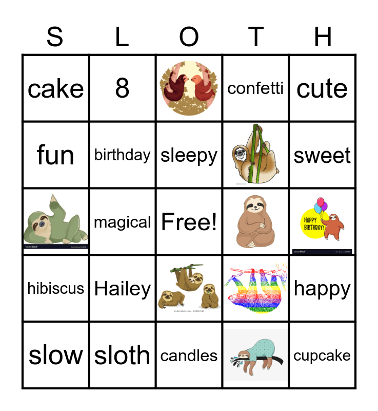 This bingo card has 8 images, a free space and 16 words: Hailey, sloth, sleepy, slow, cute, cake, fun, 8, happy, birthday, sweet, magical, cupcake, hibiscus, confetti and candles.
