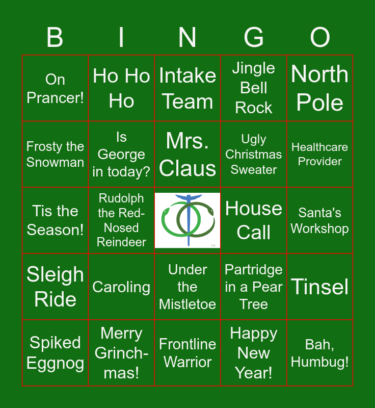 This bingo card has a free space and 65 words: Merry & Bright, Tangled Lights, Ornaments, Tinsel, Garland, Gingerbread House, Ho Ho Ho, Santa, Mrs. Claus, Jingle All the Way!, Under the Mistletoe, Elves, Santa's Workshop, North Pole, Let it Snow, Frosty the Snowman, Rudolph the Red-Nosed Reindeer, On Prancer!, Sugar Plums, Ugly Christmas Sweater, Caroling, Sleigh Ride, Jingle Bell Rock, Jack Frost, Yule Log, Deck the Halls, Naughty or Nice?, Fruitcake, Bah, Humbug!, Coal in your Stocking, Spiked Eggnog, Hot Cocoa, Presents, Cookies for Santa, Partridge in a Pear Tree, Merry Grinch-mas!, Fa La La La La, Tis the Season!, Happy New Year!, Rosie the Robot, Is George in today?, Essential Worker, House Call, Telemedicine, Dr. Wacksman's Coffee, Don't put mail on Katie's desk, Healthcare Provider, Island of Misfit Toys, Clark Griswold, Let's take an Elfie!, 2020 You Stink, Stank, Stunk!, The PCR touched my brain, Mitel Disconnected, Frontline Warrior, Specialty Care, Billing Team, MPS Operations, Intake Team, Community Development Team, How RUDE-olph of you!, 5 Gold Rings, Up to SNOW good!, Candy, Candy Canes, Candy Corn & Syrup!, Kevin McCallister and A round of Santa-PLAUSE!.