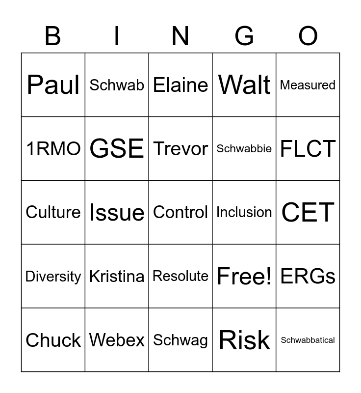 This bingo card has 27 words: Free!, Schwabbatical, Schwabbie, Schwag, 1RMO, Elaine, Schwab, Diversity, Inclusion, ERGs, Culture, Walt, Chuck, Webex, FLCT, RIM, GSE, Trevor, Kristina, Paul, CET, Risk, Issue, Control, Resolute, Measured and Objective.