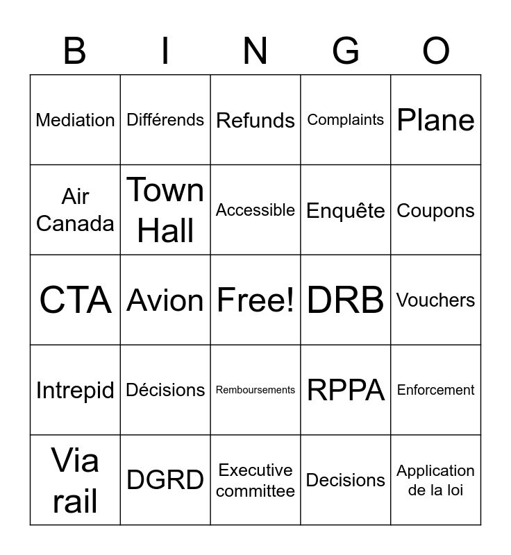 This bingo card has a free space and 42 words: Accessible, Accessible, Transport, Décisions, Decisions, Enforcement, Application de la loi, Scott, Refunds, Remboursements, Vouchers, Coupons, Avion, Plane, APPR, RPPA, OTC, CTA, Disputes, Différends, Air Canada, 60 Laval, Terrasses, Mediation, Tariff, Westjet, Enquête, Inquiry, Réunion, Meeting, Ad-Hoc, Intrepid, Town Hall, Executive committee, Comité exécutif, Via rail, DGRD, DRB, Chair, Président, Complaints and Plaintes.