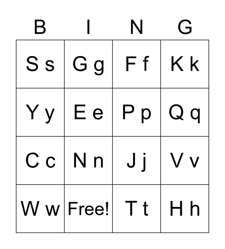 This bingo card has 27 words: A a, B b, C c, D d, E e, F f, G g, H h, Free!, I i, J j, K k, L l, M m, N n, O o, P p, Q q, R r, S s, T t, U u, V v, W w, X x, Y y and Z z.
