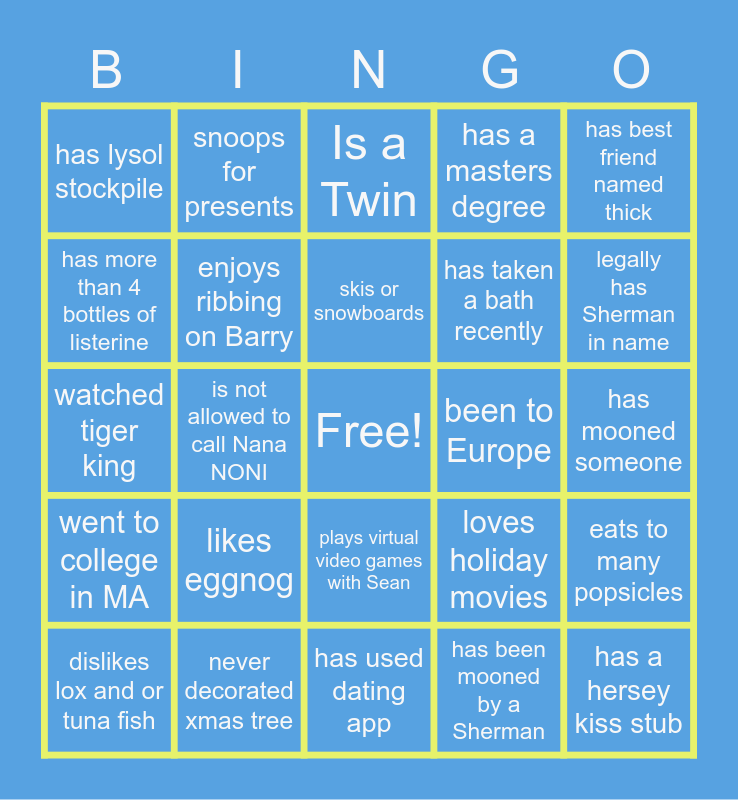 This bingo card has a free space and 24 words: likes eggnog, never decorated xmas tree, skis or snowboards, dislikes lox and or tuna fish, has best friend named thick, has lysol stockpile, has more than 4 bottles of listerine, snoops for presents, been to Europe, plays virtual video games with Sean, has taken a bath recently, watched tiger king, loves holiday movies, eats to many popsicles, enjoys ribbing on Barry, has been mooned by a Sherman, has mooned someone, Is a Twin, legally has Sherman in name, is not allowed to call Nana NONI, has a hersey kiss stub, went to college in MA, has a masters degree and has used dating app.