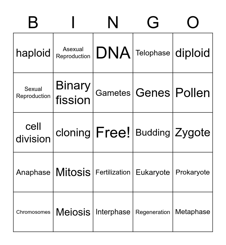 This bingo card has a free space and 24 words: Mitosis, Meiosis, Gametes, Chromosomes, diploid, haploid, Sexual Reproduction, Asexual Reproduction, Budding, Fertilization, Genes, cell division, Eukaryote, Prokaryote, Binary fission, Regeneration, Zygote, DNA, Pollen, cloning, Metaphase, Anaphase, Telophase and Interphase.
