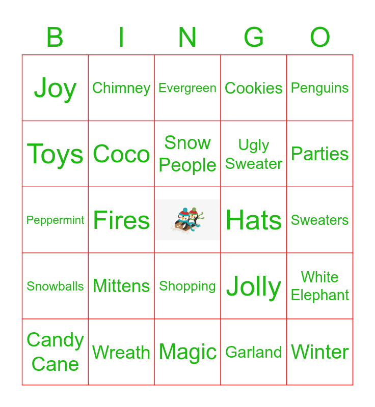 This bingo card has a free space and 39 words: Tree, Reindeer, Snow, Coco, Candy Cane, Shopping, Snow People, Elves, Penguins, Snowballs, Fires, Cookies, Winter, Sweaters, Hats, Mittens, Sledding, Joy, Festivus Pole, Jolly, Toys, Magic, Ugly Sweater, Parties, Magic, Sweets, Carols, Fun, Family, Chimney, Blizzard, Eggnog, Evergreen, Wreath, Garland, Holly, White Elephant, Peppermint and Stories.