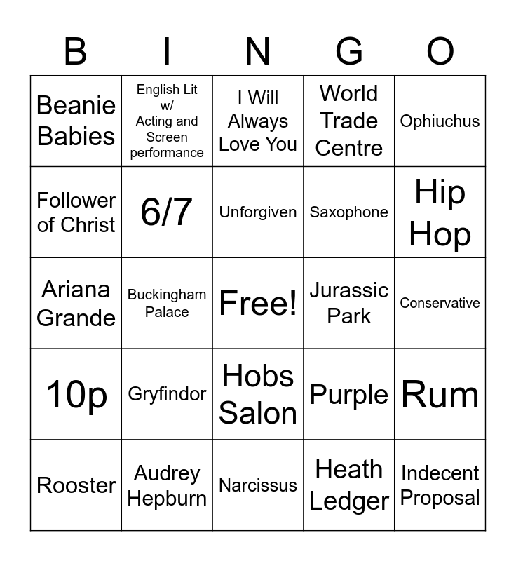 This bingo card has a free space and 31 words: Narcissus, Canada, Buckingham Palace, Turquoise, Beanie Babies, I Will Always Love You, 6/7, Purple, Jurassic Park, Heath Ledger, Conservative, Indecent Proposal, Ariel/ The Little Mermiad, 5.538 Billion, Hip Hop, Friends, Rum, Gryfindor, 10p, Hobs Salon, Ophiuchus, Crete, Rooster, English Lit w/ Acting and Screen performance, Saxophone, Follower of Christ, World Trade Centre, Ariana Grande, Audrey Hepburn, Unforgiven and Baked Beans, sausage & toast.