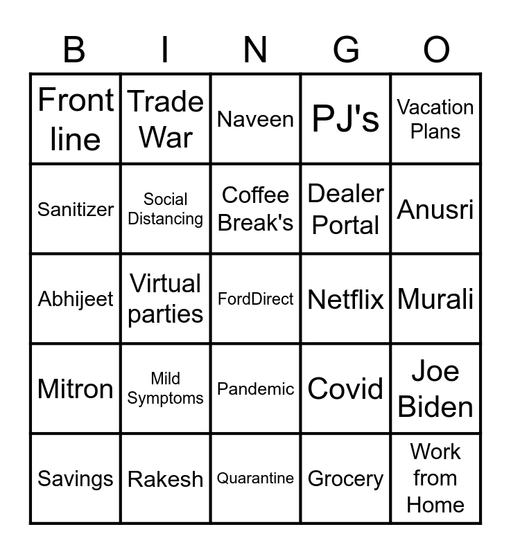 This bingo card has a free space and 49 words: 2020, Work from Home, Network Issues, Quarantine, Mild Symptoms, FDEMS, Trade War, Advantage Products, Sanitizer, 2021, Social Distancing, PJ's, Joe Biden, Covid, Face Mask, Christmas, Coffee Break's, Netflix, Birthday's this year, Vacation Plans, Virtual parties, Grocery, Front line, Dealer Portal, Money Heist, Anusri, Savings, Flatten the Curve, Pandemic, Mitron, Salute to Frontliners, George Floyd, Raja, Bama, Rakesh, Kalpana, Sarika, Ravi, Murali, Karthik, Rajesh, Vishaka, Mel, Chandra, Abhijeet, Naveen, Jero, Pradeep and Jyoti.