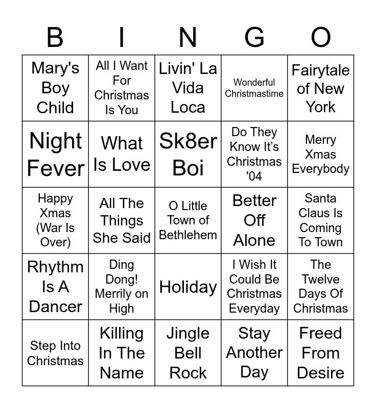 This bingo card has 71 words: Free!, All I Want For Christmas Is You, Last Christmas, Rockin' Around The Christmas Tree, Jingle Bell Rock, Feliz Navidad, Wonderful Christmastime, Do They Know It’s Christmas '84, Do They Know It’s Christmas '04, Driving Home For Christmas, Step Into Christmas, Lonely This Christmas, Merry Xmas Everybody, Mary's Boy Child, Merry Christmas Everyone, Happy Xmas (War Is Over), I Wish It Could Be Christmas Everyday, Fairytale of New York, Stop The Cavalry, Santa Claus Is Coming To Town, Ding Dong! Merrily on High, O Little Town of Bethlehem, The Twelve Days Of Christmas, It's The Most Wonderful Time of the Year, Let It Snow, Let It Snow, Let It Snow, Sleigh Ride, Holly Jolly Christmas, Santa Baby, I Saw Mommy Kissing Santa Claus, Don't You Want Me, Killing In The Name, Mad World, Sound Of The Underground, Too Much, Stay Another Day, Mistletoe and Wine, Have Yourself a Merry Little Christmas, Le Freak, Night Fever, Last Night A D.J Saved My Life, Holiday, Freed From Desire, Rhythm Is A Dancer, Saturday Night, Boom Boom Boom Boom, Ooh Add…Just A Little Bit, Sandstorm, What Is Love, The Rhythm of The Night, Macarena, We're Going To Ibiza!, Pump Up The Jam, Better Off Alone, (Mucho Mambo) Sway, C'est La Vie, ….Baby One More Time, Sk8er Boi, The Ketchup Song, Can't Get You Out Of My Head, Murder On The Dancefloor, Mambo No. 5, Toxic, All The Things She Said, Dancing Queen, 9 to 5, We Are Family, Livin' La Vida Loca, Heart of Glass, I'm Too Sexy, I Will Survive and I Want To Break Free.