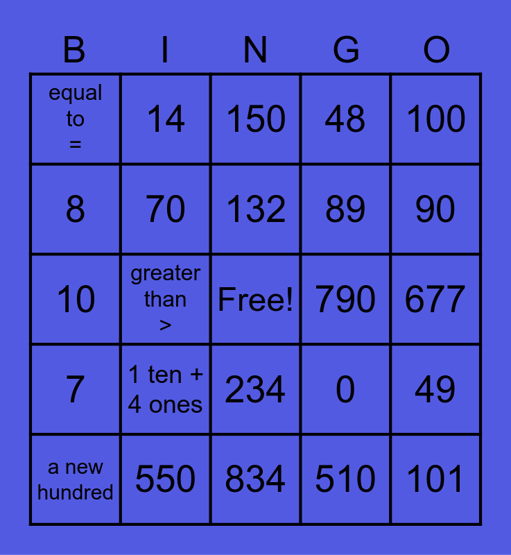 This bingo card has a free space and 29 words: a new hundred, a new ten, greater than >, less than <, equal to =, 150, 70, 1 ten + 4 ones, 790, 550, 677, 101, 834, 510, 90, 211, 234, 7, 100, 10, 0, 1, 89, 8, 48, 14, 49, 132 and Neither.