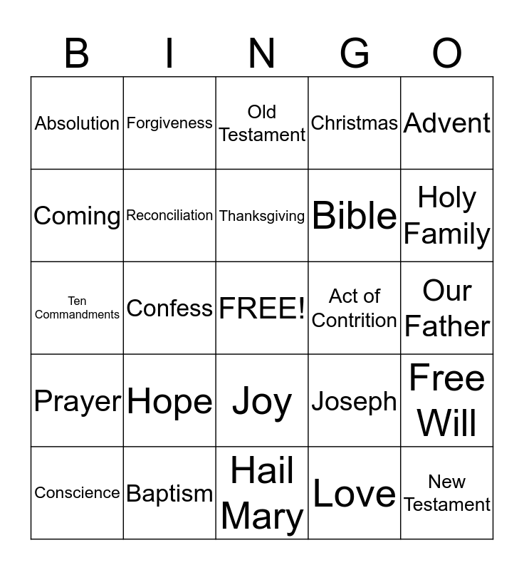 This bingo card has a free space and 30 words: Baptism, Peace, Confess, Penance, Absolution, Old Testament, Reconciliation, Joy, Act of Contrition, Hail Mary, Our Father, New Testament, Love, Communion, Holy Family, Mary, Joseph, Prayer, Hope, Advent, Ten Commandments, Sin, Forgiveness, Bible, Coming, Christmas, Free Will, Conscience, Thanksgiving and Jesus' Birthday.