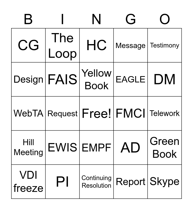 This bingo card has a free space and 29 words: VDI freeze, Audit, Request, Mandate, CG, HC, FAIS, EWIS, FMCI, PI, Telework, Skype, Continuing Resolution, Report, DM, Engagement, EMPF, Hill Meeting, Testimony, WebTA, AD, PDP, EAGLE, Design, Message, The Loop, Green Book, Yellow Book and Recommendation.