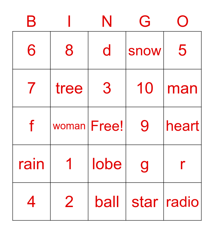 This bingo card has a free space and 24 words: 1, 2, 3, 4, 5, 6, 7, 8, 9, lobe, 10, f, g, r, tree, star, heart, d, man, woman, radio, rain, snow and ball.
