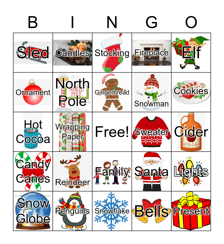 This bingo card has 28 images, a free space and 28 words: Lights, Christmas Tree, Snowman, Bells, Ornament, Stocking, Candles, Candy Canes, Sweater, Snow Globe, Hot Cocoa, Fireplace, Penguins, Snowflake, Cookies, Snow, Reindeer, North Pole, Gingerbread, Family, Sled, Ice Skates, Present, Wrapping Paper, Cider, Santa, Elf and Snow Angel.