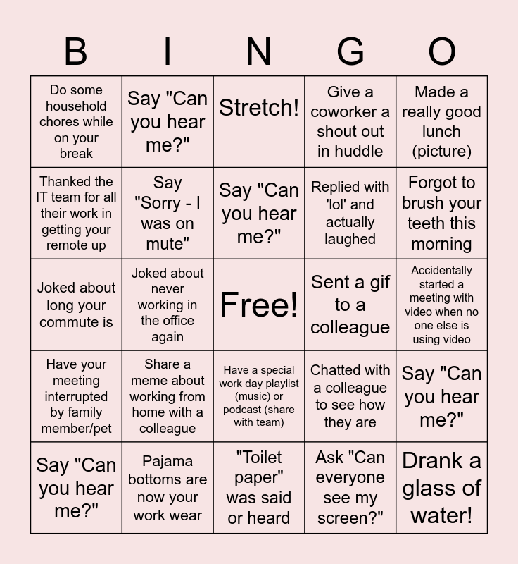 This bingo card has a free space and 29 words: Say "Can you hear me?", Did some chair yoga, Joked about never working in the office again, Talked out loud to yourself, Do some household chores while on your break, Stretch!, Say "Sorry - I was on mute", Share a meme about working from home with a colleague, Sent a gif to a colleague, Pajama bottoms are now your work wear, Accidentally started a meeting with video when no one else is using video, Drank a glass of water!, "Toilet paper" was said or heard, Ask "Can everyone see my screen?", Forgot to brush your teeth this morning, Made a really good breakfast (picture), Have a special work day playlist (music) or podcast (share with team), Have your meeting interrupted by family member/pet, Made a really good lunch (picture), Joked about long your commute is, Chatted with a colleague to see how they are, "Toilet paper" was said or heard, Replied with 'lol' and actually laughed, Thanked the IT team for all their work in getting your remote up, Give a coworker a shout out in huddle, Say "Can you hear me?", Say "Can you hear me?", Say "Can you hear me?" and Say "Can you hear me?".