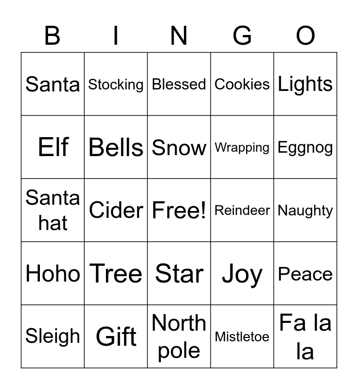 This bingo card has a free space and 24 words: Tree, Gift, Snow, Sleigh, Lights, Santa, Elf, Stocking, Reindeer, Star, Wrapping, Santa hat, Joy, Peace, Bells, Mistletoe, Naughty, Blessed, Eggnog, Cider, Fa la la, Hoho, Cookies and North pole.