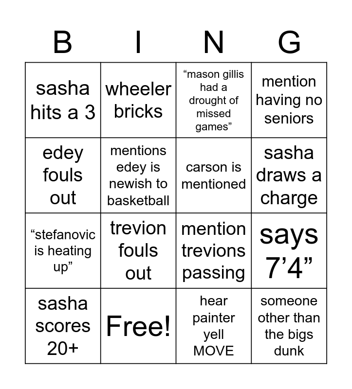 This bingo card has 16 words: Free!, says 7’4”, “mason gillis had a drought of missed games”, sasha hits a 3, “stefanovic is heating up”, wheeler bricks, mention trevions passing, hear painter yell MOVE, edey fouls out, mentions edey is newish to basketball, sasha scores 20+, mention having no seniors, trevion fouls out, sasha draws a charge, carson is mentioned and someone other than the bigs dunk.