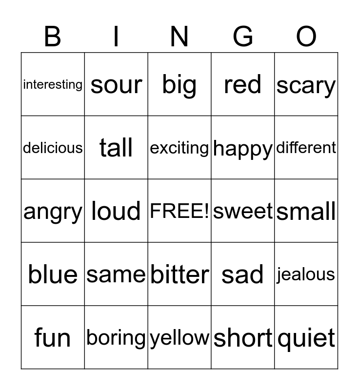 This bingo card has a free space and 24 words: same, boring, exciting, fun, scary, interesting, delicious, sour, sweet, bitter, happy, angry, sad, jealous, tall, short, small, big, different, loud, quiet, blue, red and yellow.