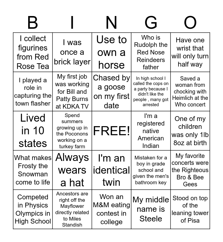 This bingo card has a free space and 24 words: Always wears a hat, Ancestors are right off the Mayflower directly related to Miles Standish, Chased by a goose on my first date, Competed in Physics Olympics in High School, Have one wrist that will only turn half way, I collect figurines from Red Rose Tea, I played a role in capturing the town flasher, I was once a brick layer, I'm a registered native American Indian, I'm an identical twin, In high school I called the cops on a party because I didn't like the people , many got arrested, Lived in 10 states, Mistaken for a boy in grade school and given the men's bathroom key, My favorite concerts were the Righteous Bro & Bee Gees, My first job was working for Bill and Patty Burns at KDKA TV, My middle name is Steele, One of my children was only 1lb 8oz at birth, Use to own a horse, Saved a woman from chocking with Heimlich at the Who concert, Spend summers growing up in the Poconons working on a turkey farm, Stood on top of the leaning tower of Pisa, What makes Frosty the Snowman come to life, Who is Rudolph the Red Nose Reindeers father and Won an M&M eating contest in college.