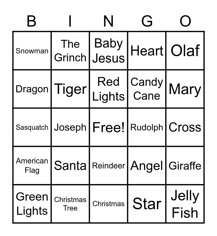 This bingo card has a free space and 25 words: Santa, Christmas, Red Lights, Green Lights, Olaf, Snowman, Dragon, The Grinch, Rudolph, Reindeer, Candy Cane, Sasquatch, Angel, Giraffe, Tiger, Elephant, Cross, Baby Jesus, Mary, Joseph, Jelly Fish, Christmas Tree, American Flag, Heart and Star.