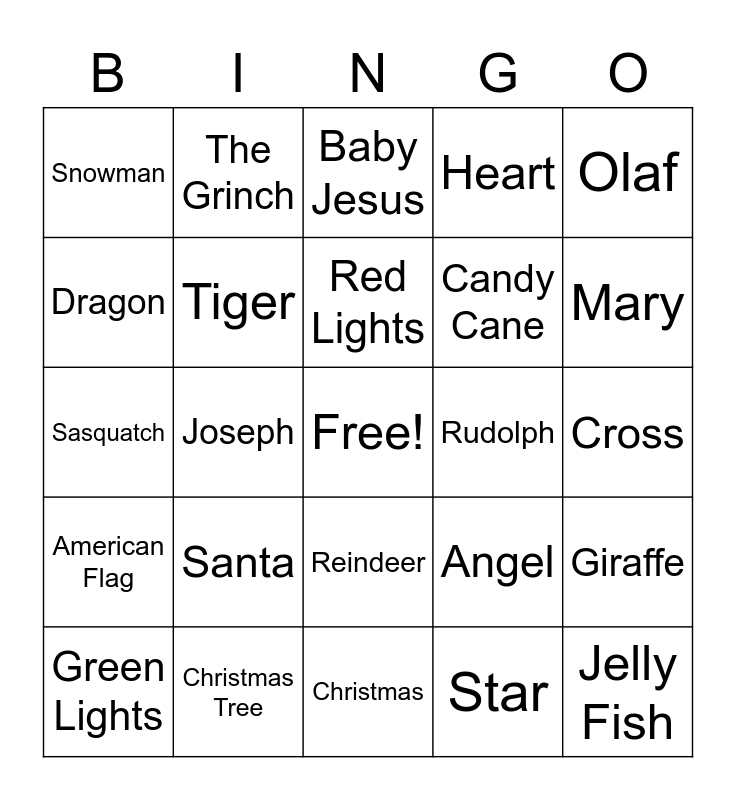 This bingo card has a free space and 25 words: Santa, Christmas, Red Lights, Green Lights, Olaf, Snowman, Dragon, The Grinch, Rudolph, Reindeer, Candy Cane, Sasquatch, Angel, Giraffe, Tiger, Elephant, Cross, Baby Jesus, Mary, Joseph, Jelly Fish, Christmas Tree, American Flag, Heart and Star.