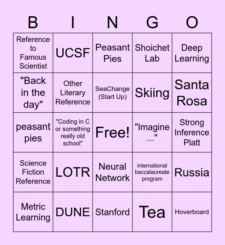 This bingo card has a free space and 24 words: LOTR, DUNE, SeaChange (Start Up), Metric Learning, Deep Learning, Reference to Famous Scientist, "Back in the day", UCSF, "Imagine ...", Neural Network, Skiing, peasant pies, international baccalaureate program, Russia, Other Literary Reference, Tea, Strong Inference Platt, Peasant Pies, Santa Rosa, "Coding in C or something really old school", Hoverboard, Science Fiction Reference, Shoichet Lab and Stanford.