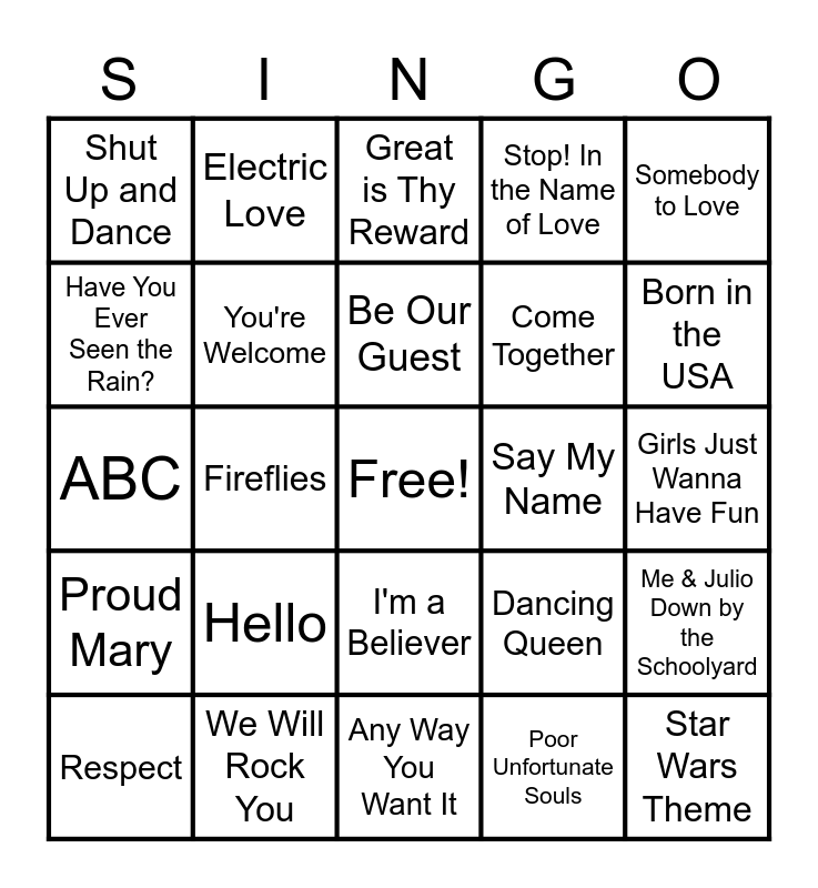 This bingo card has a free space and 24 words: Hello, We Will Rock You, Be Our Guest, Respect, Somebody to Love, Shut Up and Dance, Have You Ever Seen the Rain?, Electric Love, Say My Name, I'm a Believer, Come Together, ABC, Dancing Queen, Me & Julio Down by the Schoolyard, You're Welcome, Poor Unfortunate Souls, Girls Just Wanna Have Fun, Great is Thy Reward, Born in the USA, Fireflies, Star Wars Theme, Proud Mary, Stop! In the Name of Love and Any Way You Want It.