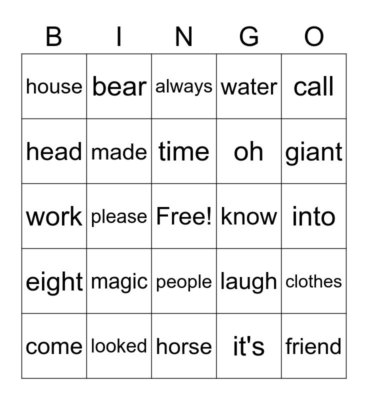 This bingo card has a free space and 29 words: come, asked, please, school, house, always, made, magic, know, looked, into, friend, horse, it's, giant, I'm, people, eight, call, work, laugh, through, oh, head, water, bear, clothes, time and came.
