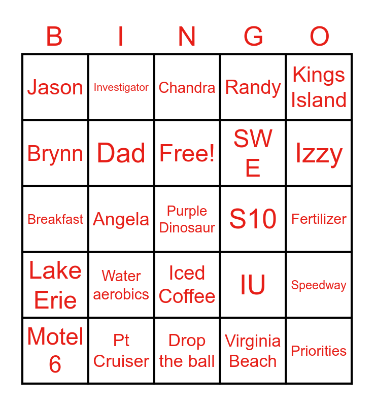 This bingo card has 60 words: 14, Pt Cruiser, Mini van, S10, Buffet, Grandkids, Dad, Papaw, Randy, Aubree, Brynn, Claire, Free!, Cooper, Bev, Jason, Angela, Chandra, Scot, Izzy, Breakfast, Investigator, Drop the ball, IU, Steelers, Pay to see me play, Weebles wobble, Park Terrace, SW E, Equinox, Lasagna, Reubens, Salmon casserole, B and B Riverboat, Kings Island, Motel 6, Myrtle Beach, Purple Dinosaur, Italian, Fertilizer, Mowing, Water aerobics, Iced Coffee, Work before play, Priorities, Baboomba, 12 more payments, Chicken cacciatore, Movies, Speedway, Lake Erie, Daytona Beach, Larry Bird, Bill Clinton, Bruce Lee, Slyvester Stallone, Holy Family, Earlham, Virginia Beach and Sea World.