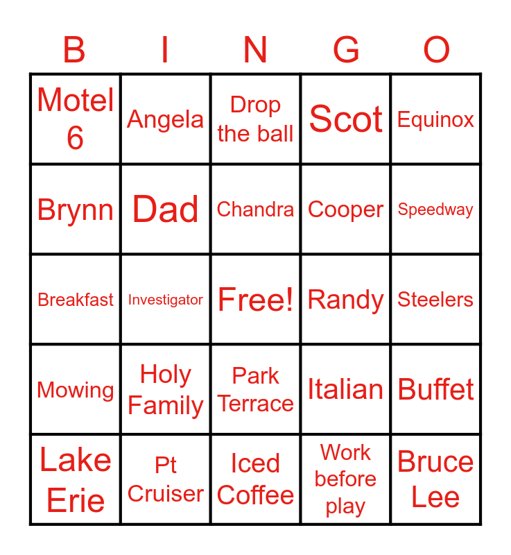 This bingo card has a free space and 59 words: 14, Pt Cruiser, Mini van, S10, Buffet, Grandkids, Dad, Papaw, Randy, Aubree, Brynn, Claire, Cooper, Bev, Jason, Angela, Chandra, Scot, Izzy, Breakfast, Investigator, Drop the ball, IU, Steelers, Pay to see me play, Weebles wobble, Park Terrace, SW E, Equinox, Lasagna, Reubens, Salmon casserole, B and B Riverboat, Kings Island, Motel 6, Myrtle Beach, Purple Dinosaur, Italian, Fertilizer, Mowing, Water aerobics, Iced Coffee, Work before play, Priorities, Baboomba, 12 more payments, Chicken cacciatore, Movies, Speedway, Lake Erie, Daytona Beach, Larry Bird, Bill Clinton, Bruce Lee, Slyvester Stallone, Holy Family, Earlham, Virginia Beach and Sea World.